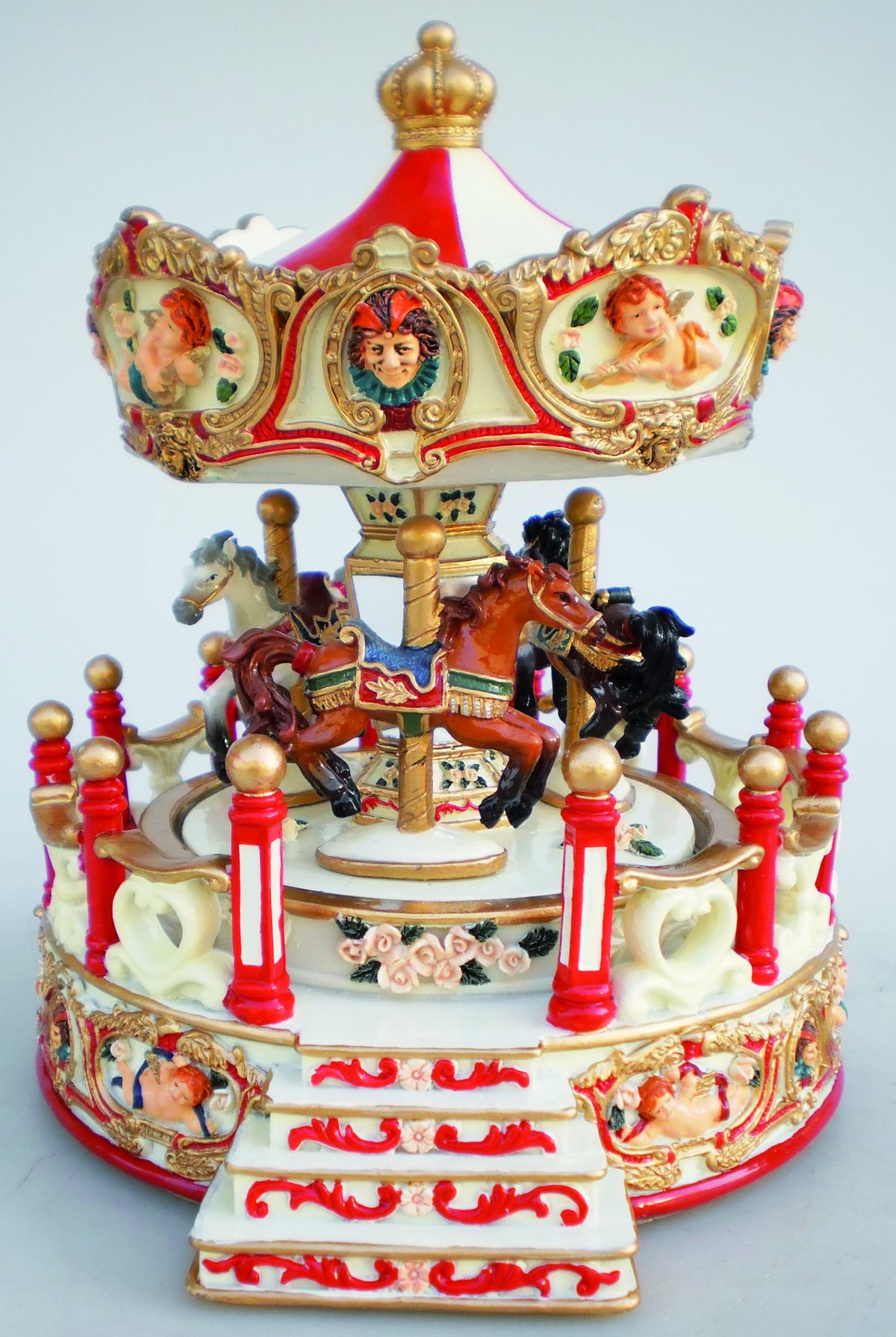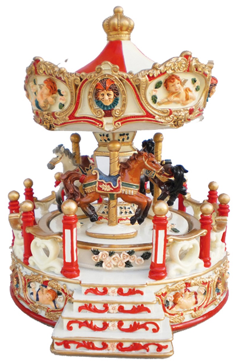 Carousel κόκκινο με τρία άλογα στηριγμένα σε στήλους από την βάση αγγελάκια στην μετώπη. Περιστρέφεται υπο την μελωδία Moonlight Sonata. Φτιαγμένη από από ρητίνη(επεξεργασμένη πορσελάνη) Διαστάσεις 13x15x17cm