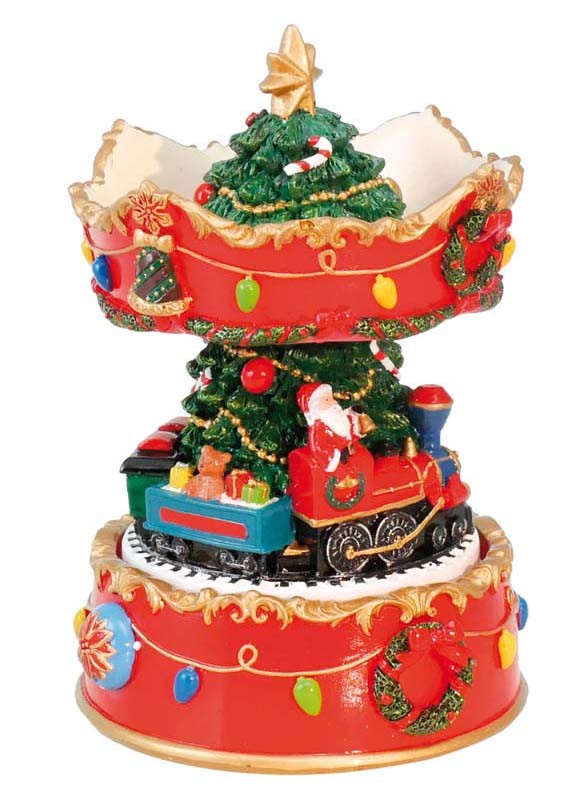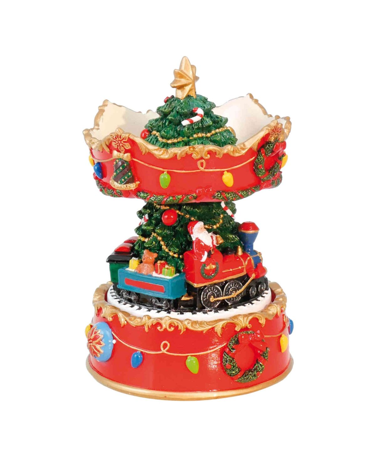 Carousel κόκκινο με ένα δέντρο και ένα τρένο που φέρει τον Αγ. Βασίλη και περιστρέφεται Ανάγλυφη βάση και μετώπη με πολλές λεπτομέριες. Φτιαγμένη από ρητίνη(επεξεργασμένη πορσελάνη). Διαστάσεις 12x12x16cm, γυρίζει υπό την μελωδία We Wish You A Merry Christmas