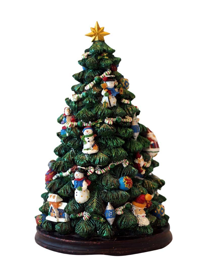 Χριστουγεννιάτικο δέντρο από επεξεργασμένη ριτίνη διαστάσεων 18x30cm. Aναπαράγει 8 διαφορετικές μελωδίες. Λειτουργεί με μπαταρίες που δεν περιλαμβάνονται.