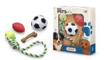 4 διασκεδαστικά παιχνίδια για το κατοικίδιό σου με αθλητικό θέμα. Ποικιλία λειτουργιών και υφών για να διεγείρουν και να διασκεδάζουν τα σκυλιά: μαλακή υφασμάτινη μπάλα ποδοσφαίρου, στριγγυλή μπάλα ράγκμπι, μπάλα τένις με σχοινί, συμπαγές κόκκαλο για μάσημα. Ιδανικά για τη διασκέδαση, την άσκηση και την ευεξία του σκύλου σου! Κατάλληλα για σκυλιά όλων των μεγεθών.