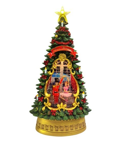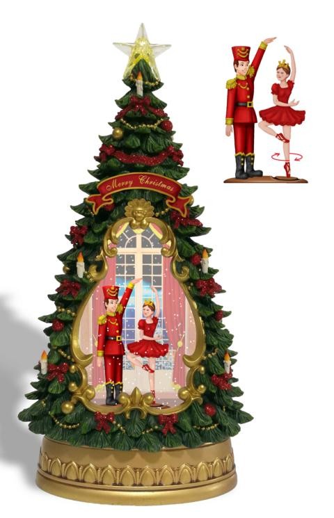 Δεντρο με καρυοθραύστη και μπαλαρίνα. Τριπλή λειτουργία α)φωτισμό και αναδευση glitter β)φωτισμός αναδευση glitter και μουσική. Γ)απλη διακόσμηση. Aναπαράγει 8 διαφορετικές μελωδίες. Λειτουργεί με μπαταρίες που δεν περιλαμβάνονται. Yψος 35cm