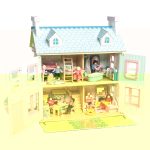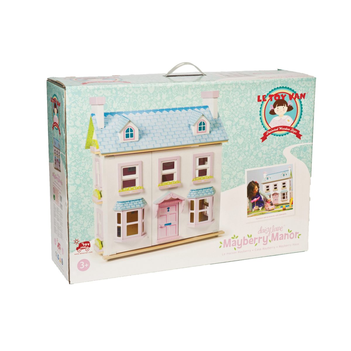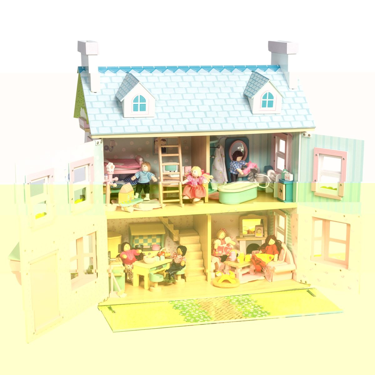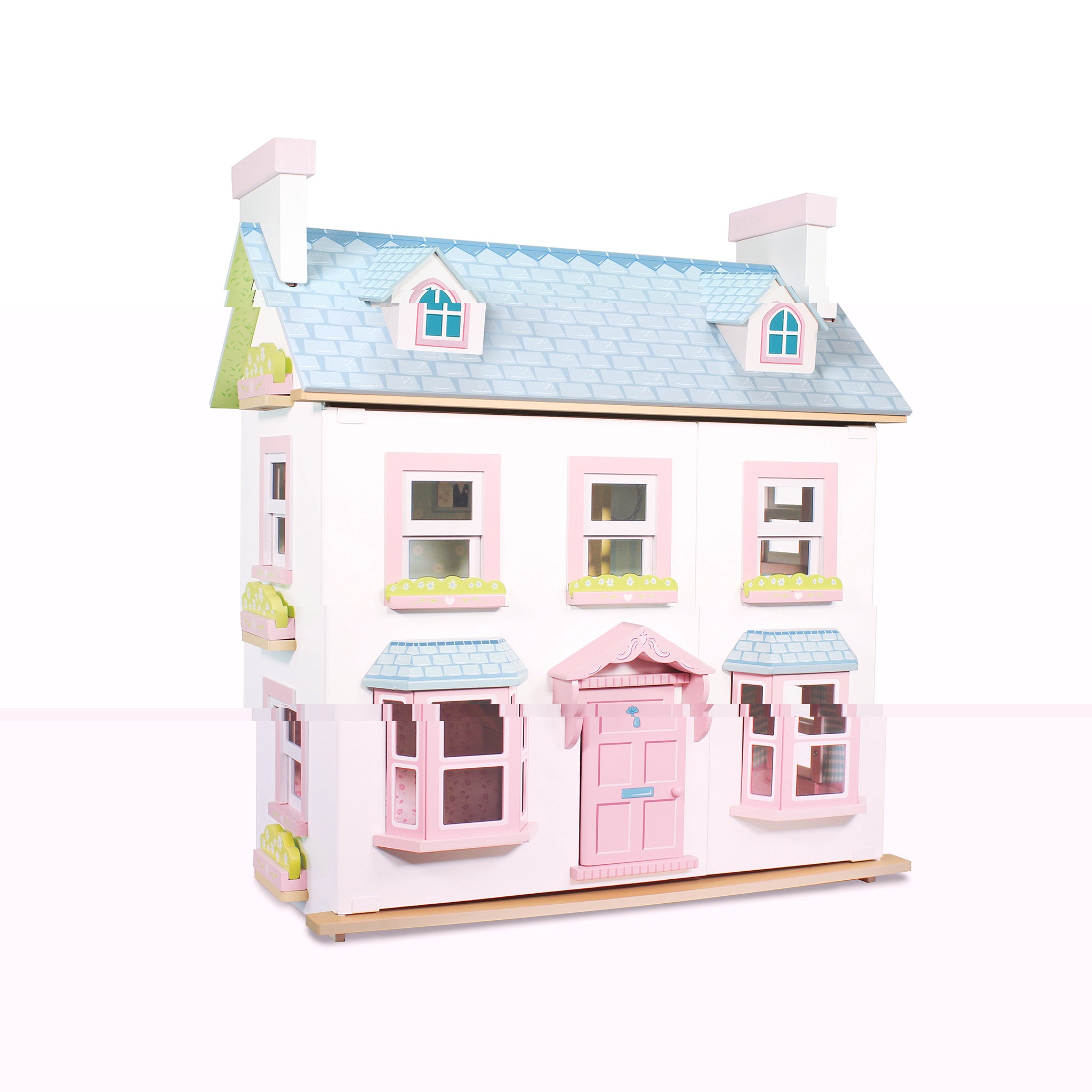 Κουκλόσπιτο ροζ λευκό δύο ορόφων με γαλάζια στέγη εκληκτικά παράθυρα και πόρτα χωρίς έπιπλα. Κατασκευασμένο από ξύλο FSC και βαμμένα με υψηλής ποιότητας υδατοχρώματα. Διαστάσεις 63x35x69cm Ηλικία 3+