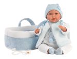 Νεογέννητο αγόρι 42cm σε λευκό φορμάκι με γαλάζιa ζακέτα και σκούφο κάθεται σε λευκό-γαλάζιο portbebe ενώ έχει περιστρρεφόμενα άκρα. Πιέζοντάς το κλαίει και φωνάζει μαμά μπαμπα.. Κατασκευασμένο στην Ισπανία. Με εξαιρετικές λεπτομέριες σε σε πρόσωπο και άκρα.