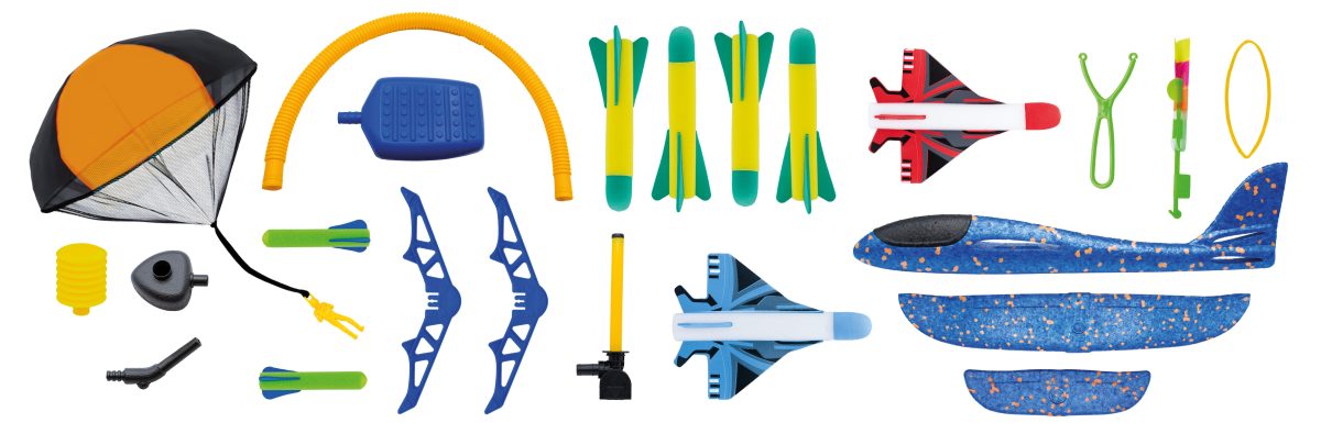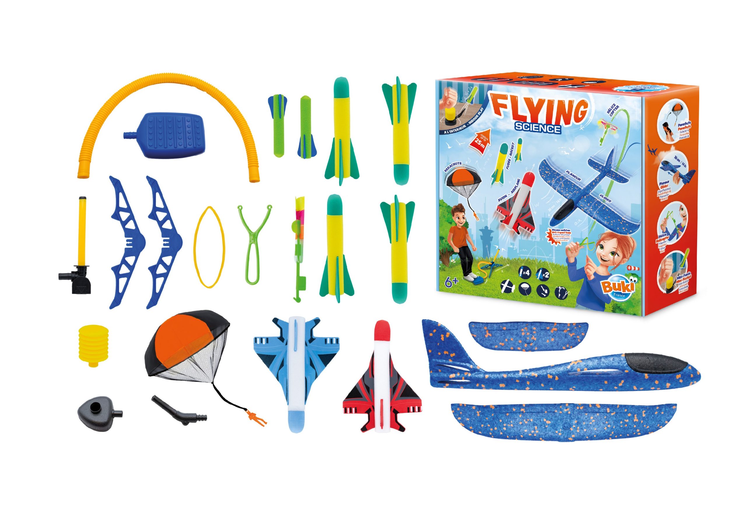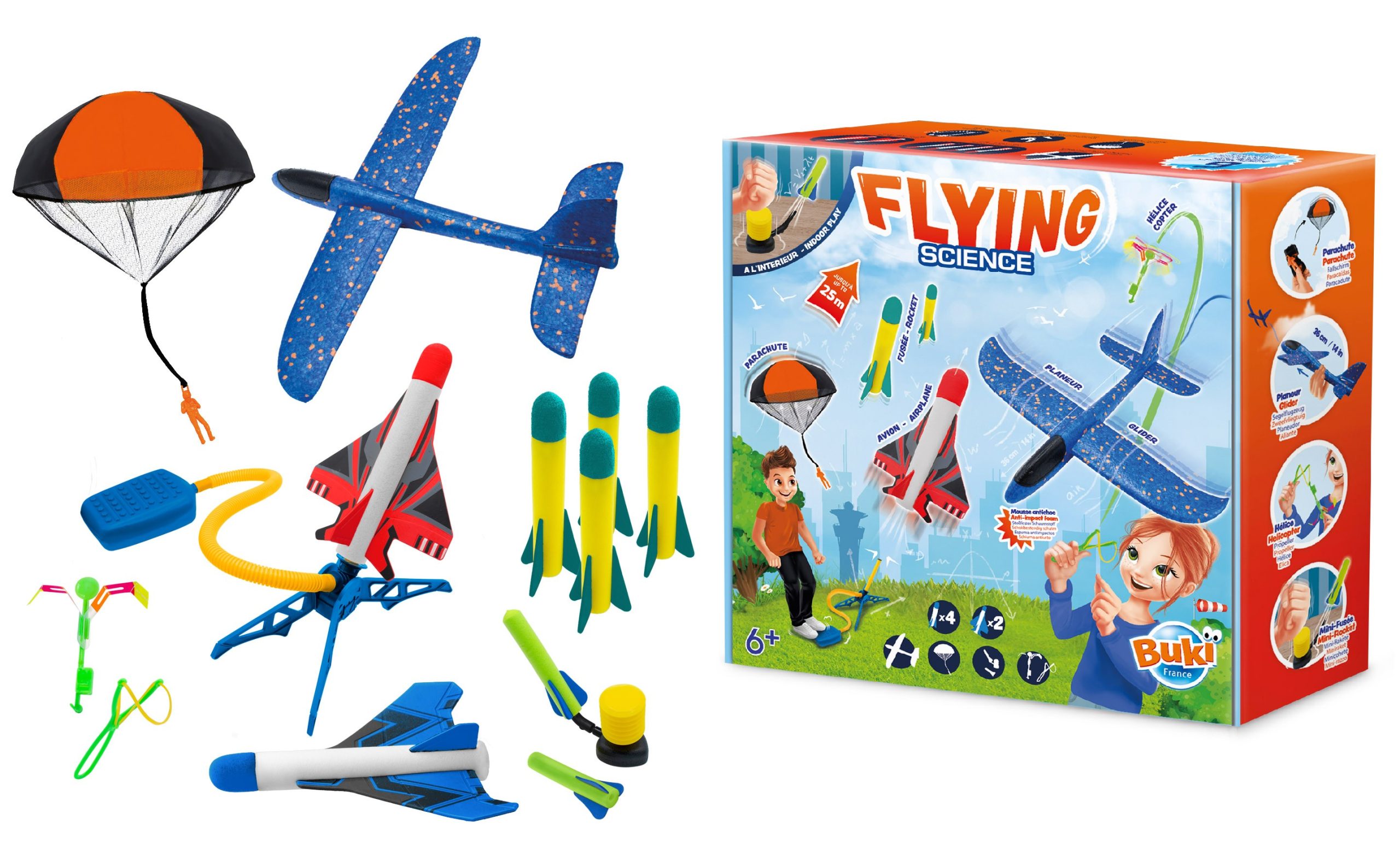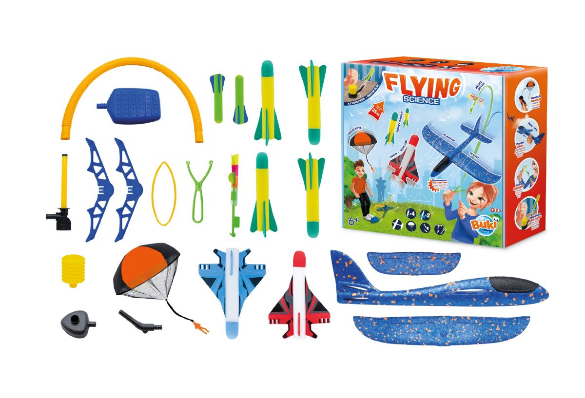 Ανακαλύψτε 5 ιπτάμενες μηχανές για να δοκιμάστε σε εξωτερικούς χώρους: Ρουκέτα Αεριωθούμενο αεροπλάνο Ανεμοπλάνα Εκτοξευτής ελικοπτέρουΑλεξίπτωτο Οι πύραυλοι μπορούν να πετάξουν έως και 20 μέτρα ύψος! Περιλαμβάνεται: ένας μίνι εκτοξευτής προς παίζουν σε εξωτερικούς χώρους Οδηγίες που απεικονίζονται με χρώματα και προτείνει πτήση 6 ετών +